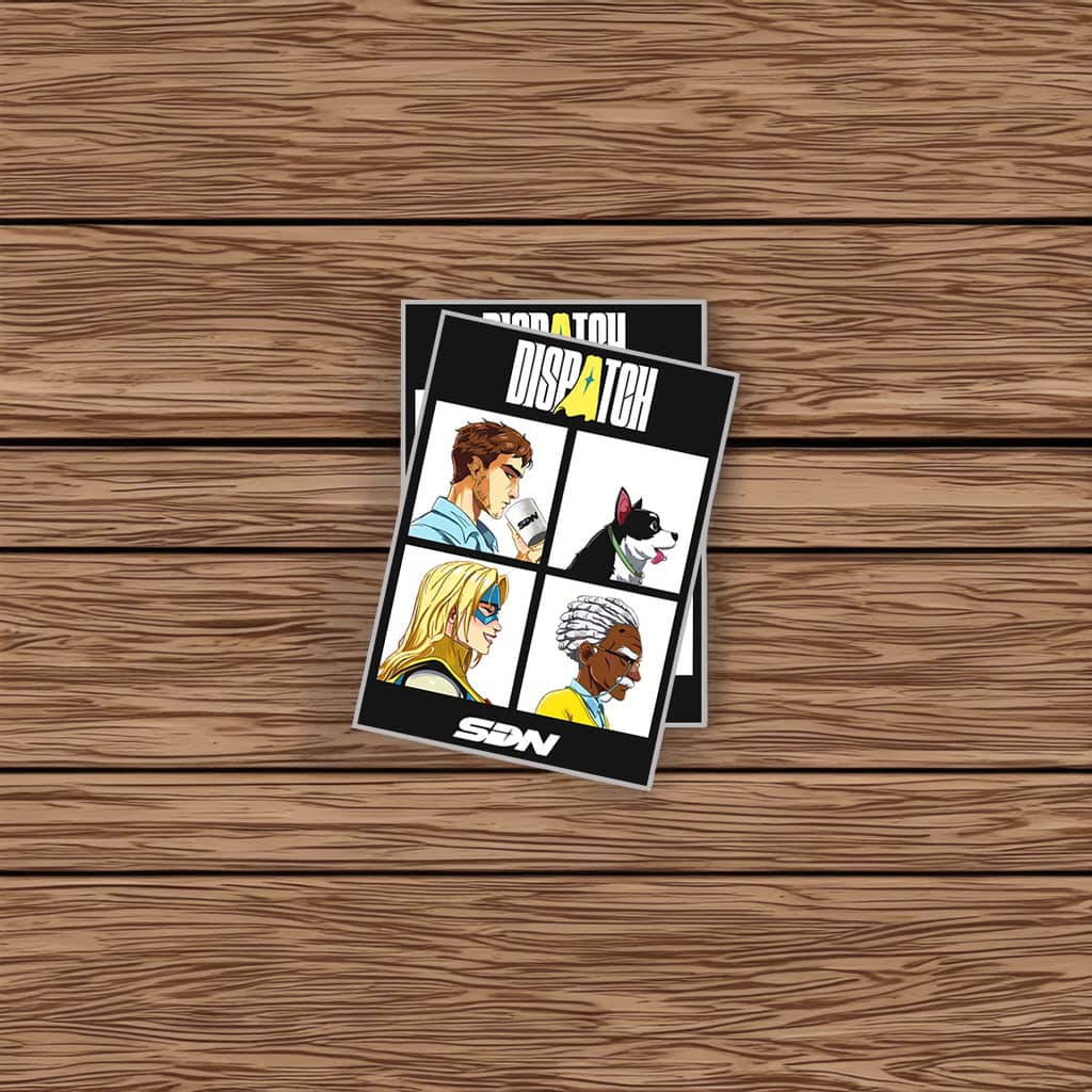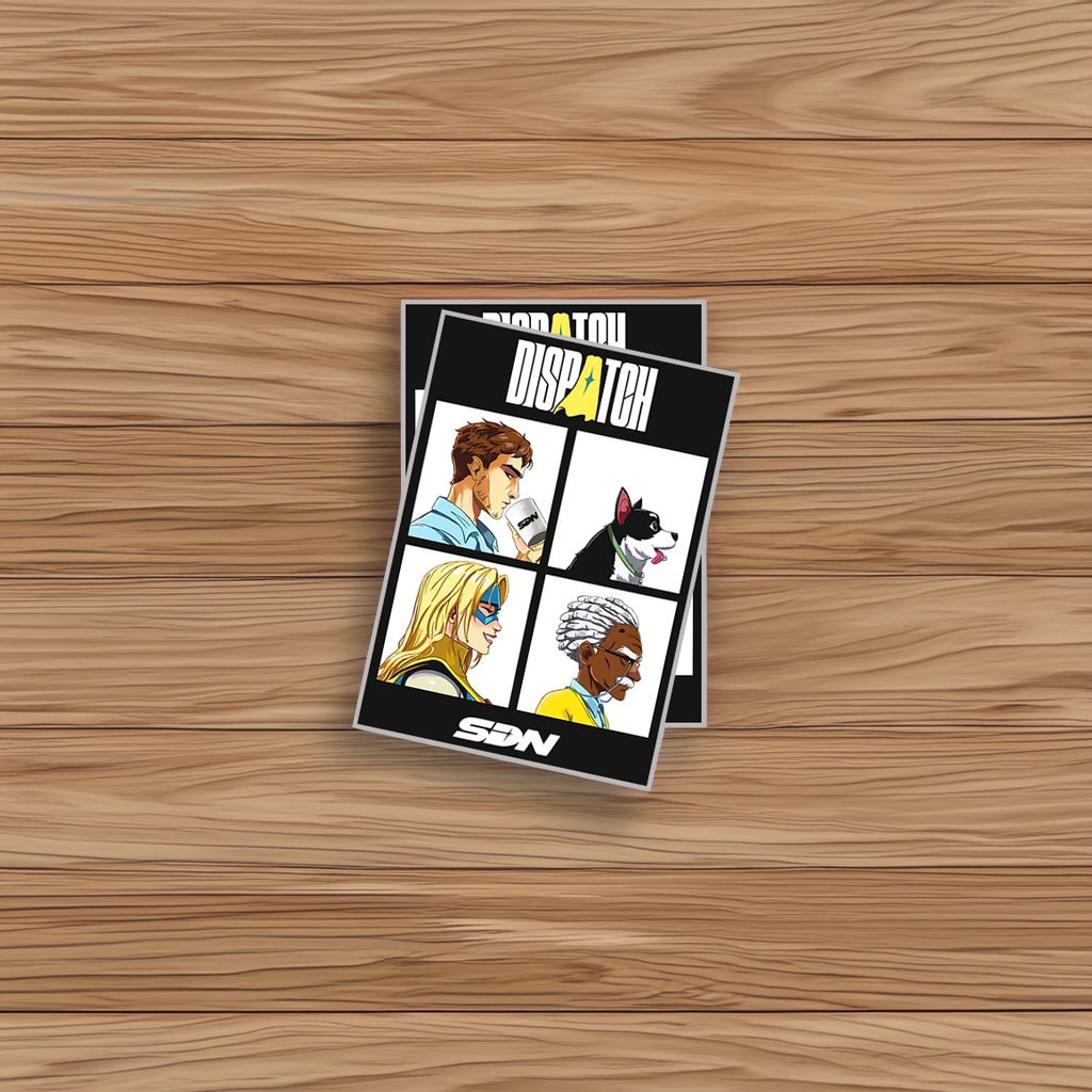 Dispatch Character Grid Retro Comic Sticker – Vintage Comic-Style Collectible Decal