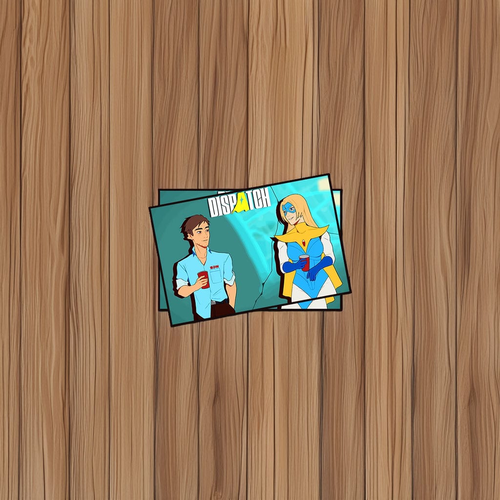 Take a breather between missions with the Dispatch Coffee Break Hero Duo Casual Comic Sticker, a charming, lighthearted design that shows two heroes enjoying a quiet coffee moment. Blending casual vibes with classic comic style, this sticker highlights friendship, downtime, and the human side of hero life in the Dispatch universe.