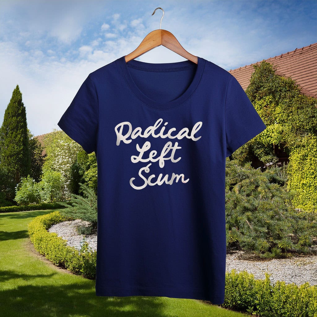 The phrase “Radical Left Scum” is intentionally provocative, making this apparel ideal for those who appreciate political commentary, satire, and bold messaging. It’s designed to spark conversation, express viewpoint, and reflect confidence without compromise. This also makes it a striking gift for anyone who enjoys edgy political fashion.