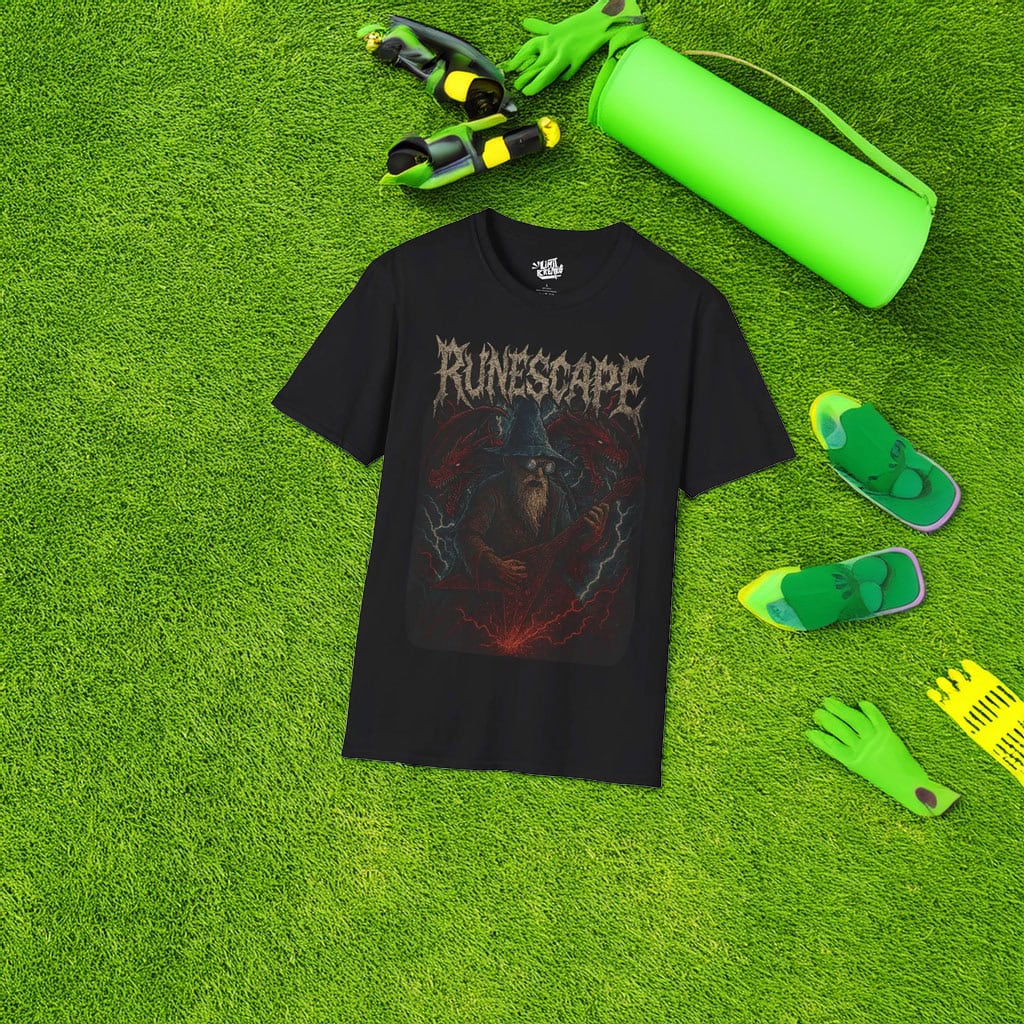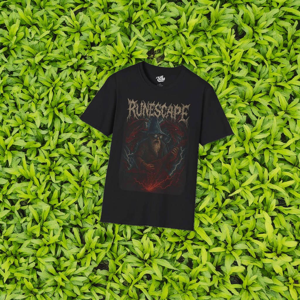Designed with a metal-style graphic look, this tee blends dark fantasy, RPG culture, and aggressive typography into one bold statement. It’s perfect for fans who love RuneScape lore but want something tougher and more underground than typical gaming merch.